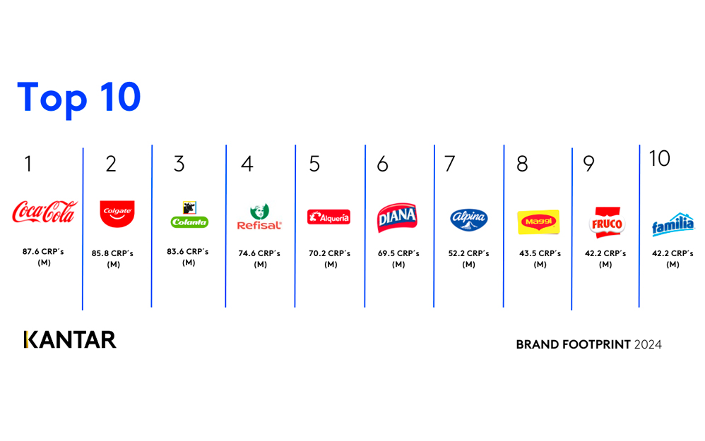 En su 12.ª edición del ranking Brand Footprint, dentro de los diez primeros lugares, y después de varios años cambian las posiciones, Coca-Cola ocupa el primer lugar. Tres marcas de Lácteos se mantienen en el listado de las diez marcas más elegidas a total FMCG, Colanta, Alquería y Alpina.